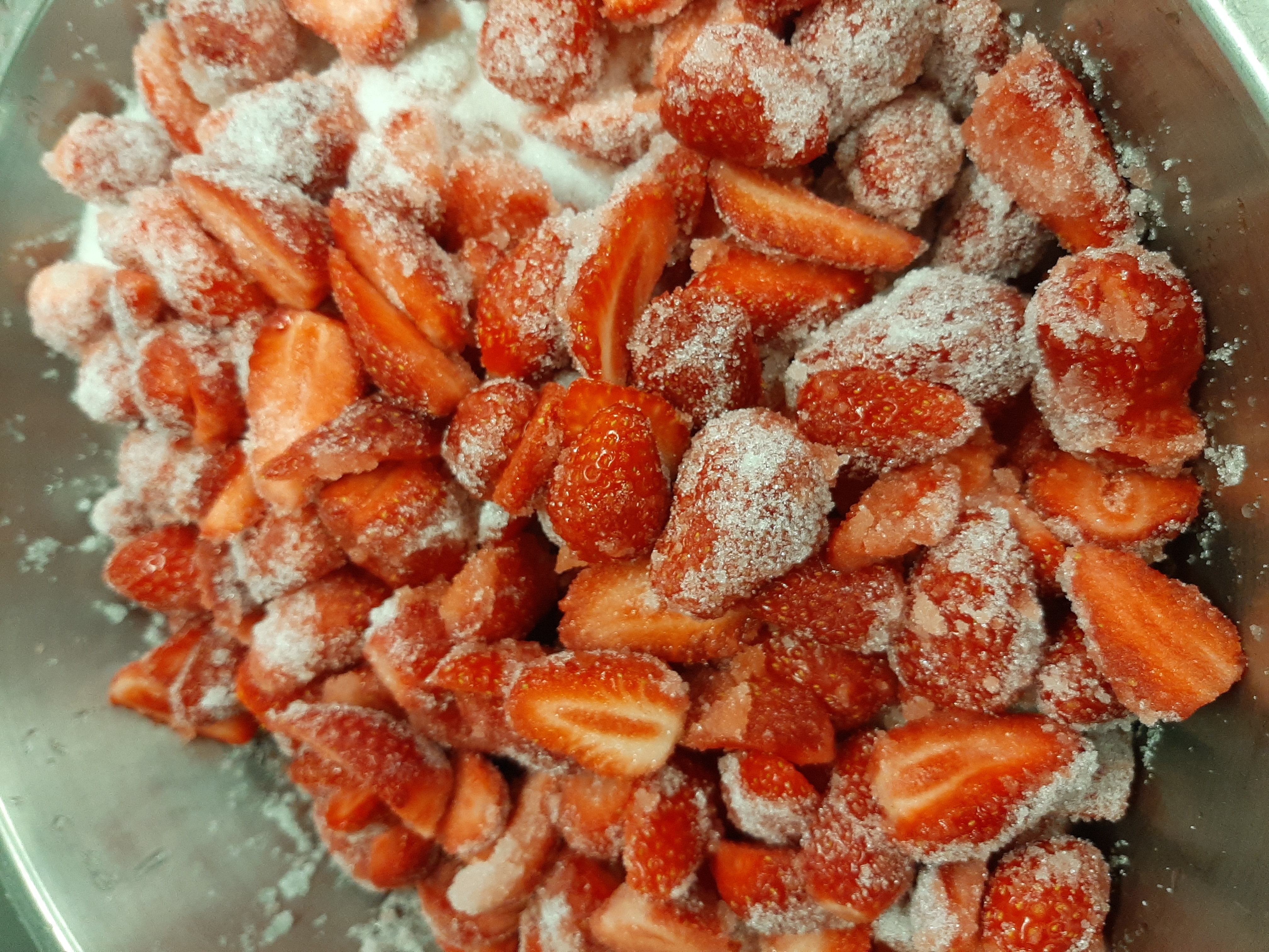 laver soigneusement les fraises, les rincer, les équeuter. Les mettre dans un grand plat, ajouter le sucre et le jus des citrons, couvrir et réserver au frigo une nuit environ.