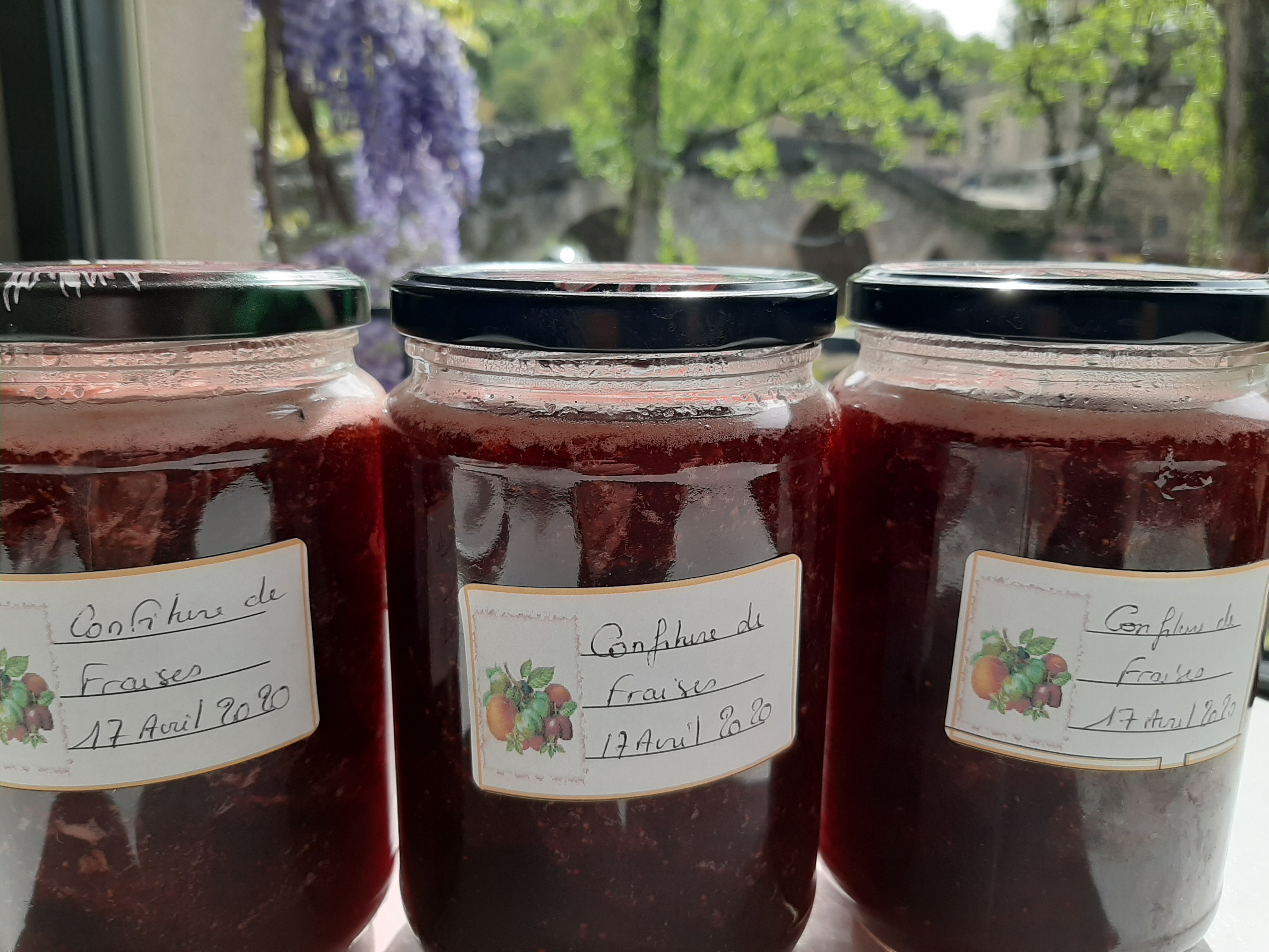 Les confitures servies aux petits déjeuners de l’hôtel du Vieux Pont à Belcastel, de l’hôtel la ferme de Bourran à Rodez mais aussi avec le plateau de fromages du restaurant sont faites maison. Aujourd’hui, ma préférée, la confiture (ou plutôt marmelade) de fraises vanille.