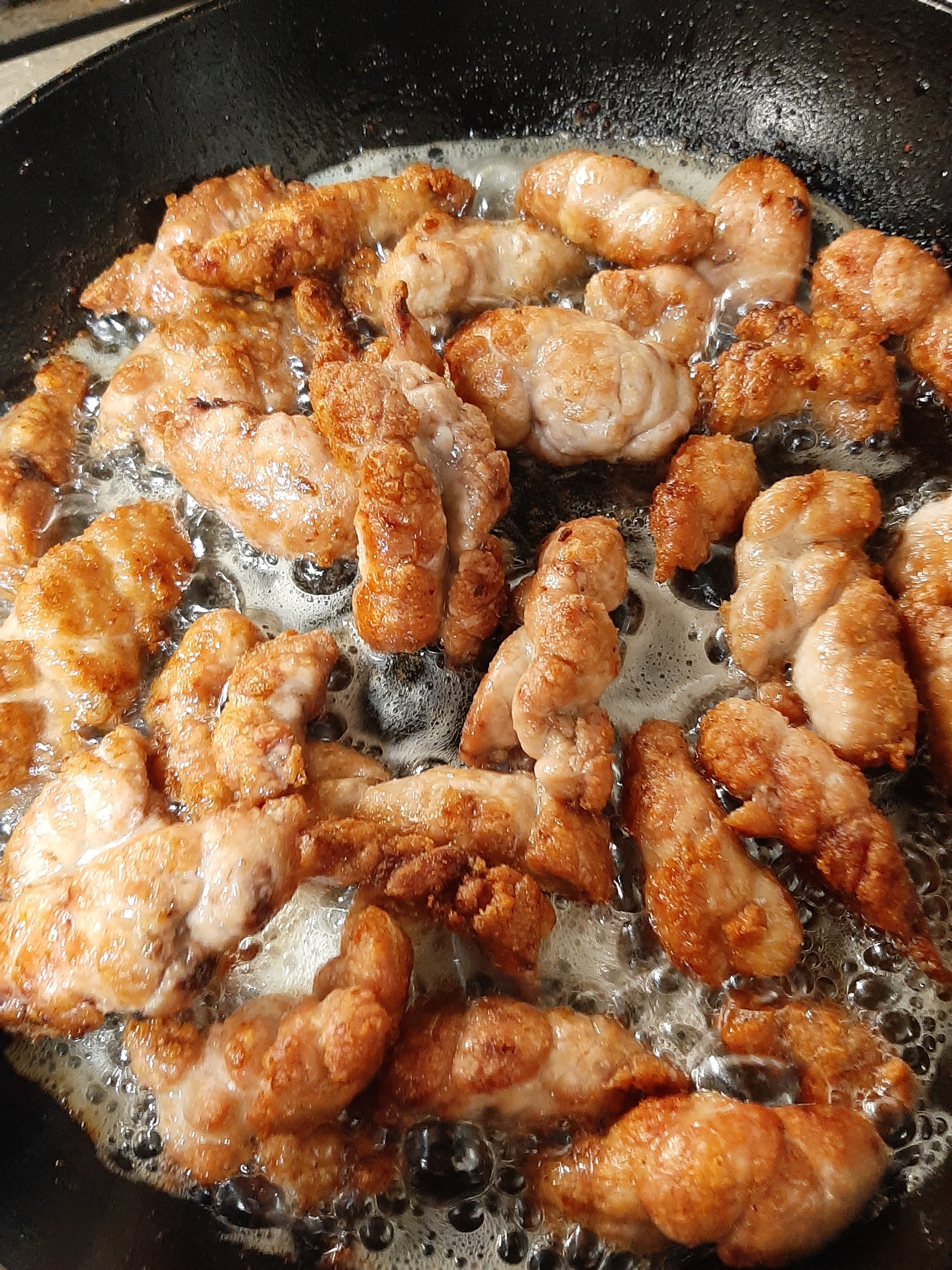 Les pommes de terre :Éplucher et laver les pommes de terre, les émincer. Dans une poêle, verser une huile neutre, verser les pommes de terre émincées et retourner souvent; Elles doivent être à la fois croustillantes et moelleuses.