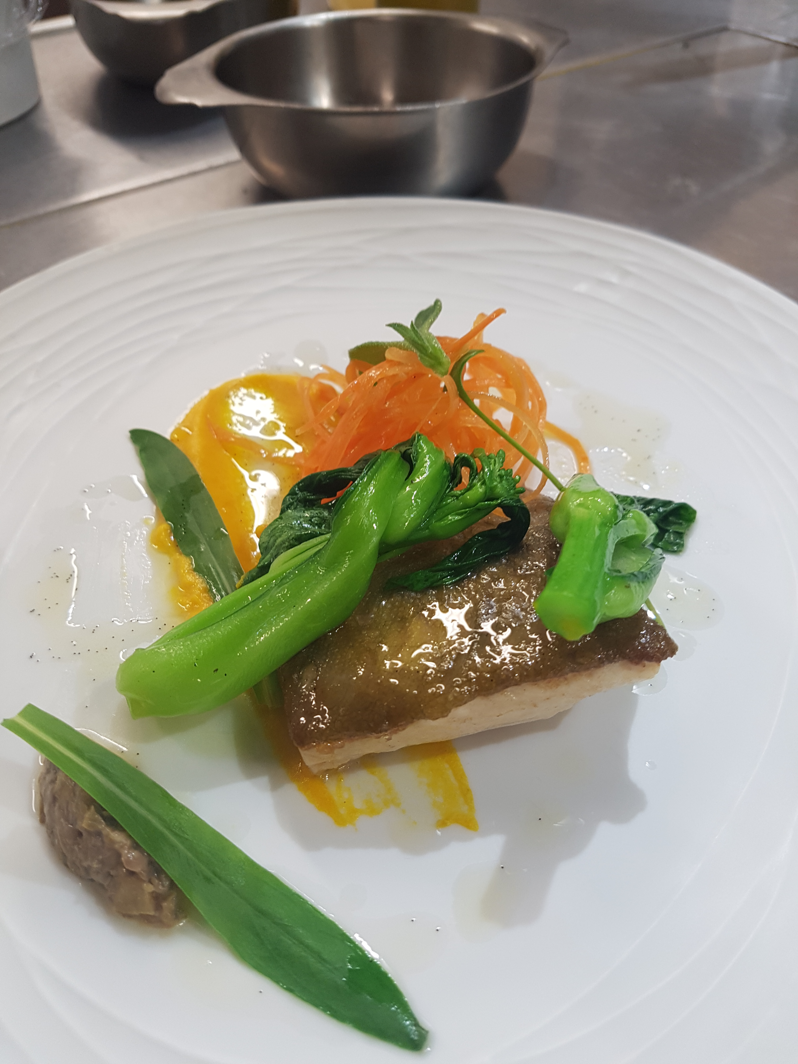 Filet de cabillaud dans un jus de crustacés, pommes de terre safranées et blettes