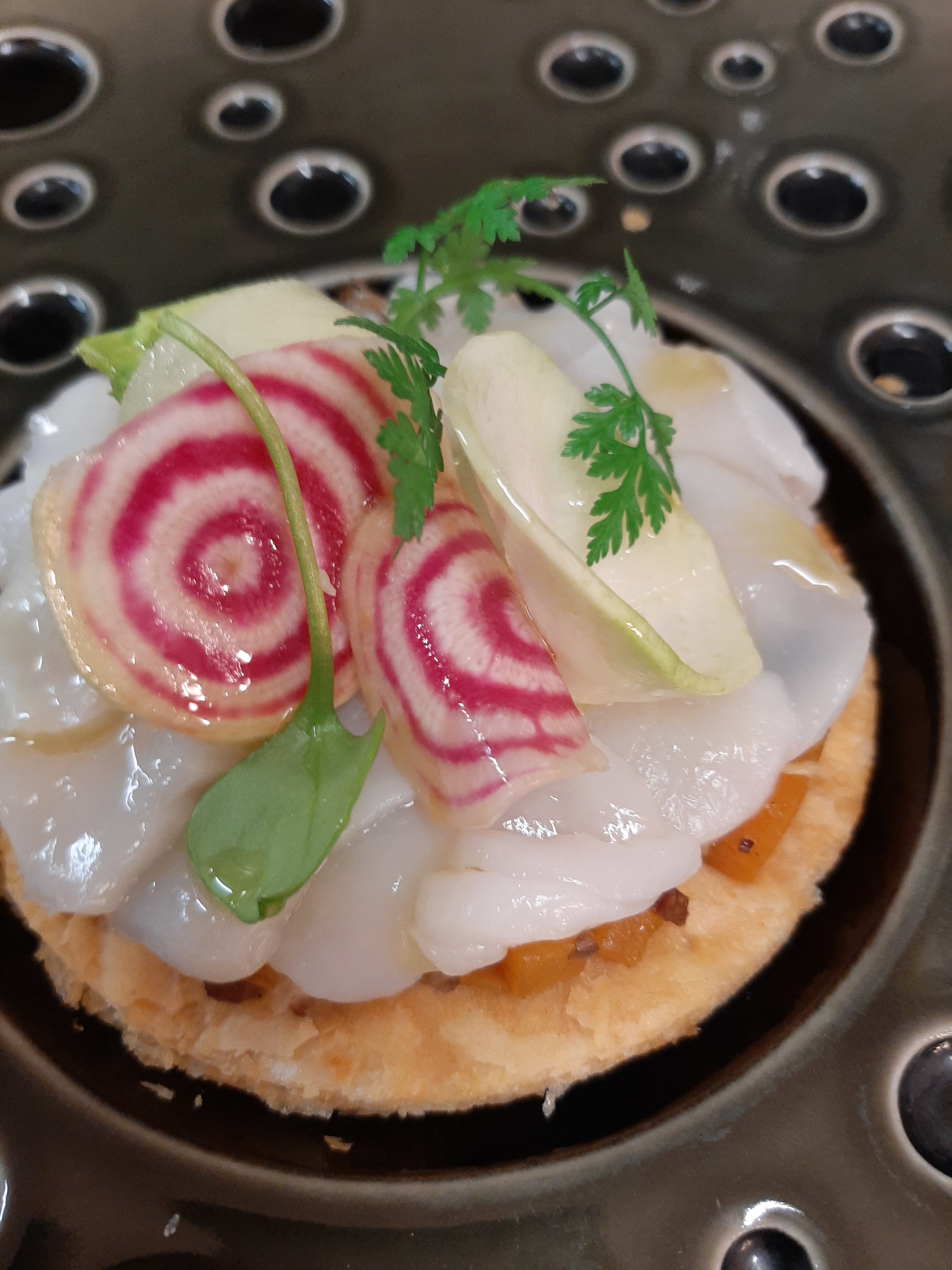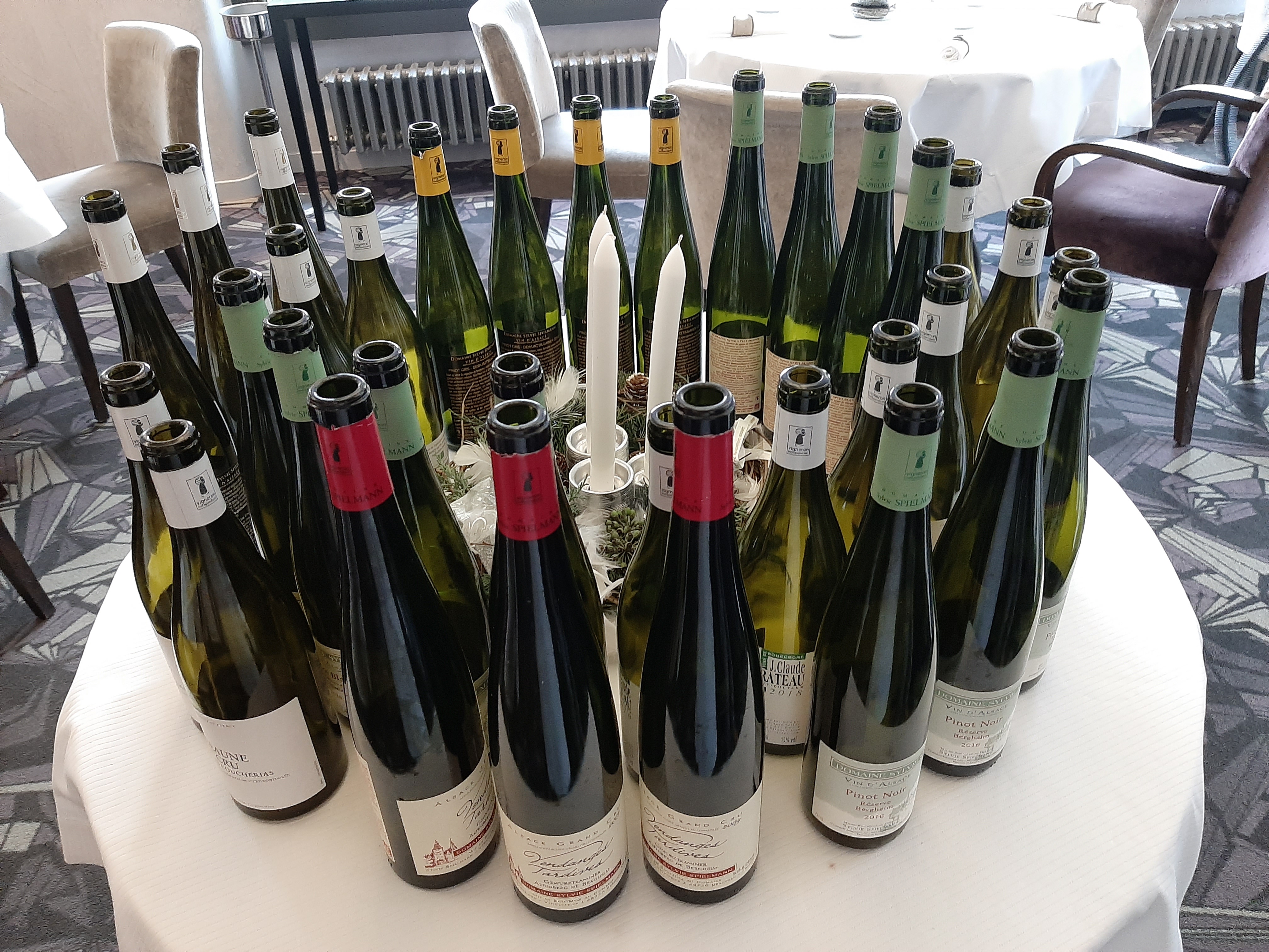Delicieux Alsace gris Blosengerg à l’apéritif, la tartelette de Saint-Jacques était accompagnée par un Alsace Pinot Blanc 2018, et un Haut-côtes de Beaunes blanc 2018. Les vin orange en accord avec la dorade ont beaucoup surpris…très particulier pour certains ! Puis, nos convives devaient découvrir deux vins sur le faisan….pas facile ! ensuite, un alsace Gypse 2018 et un Beaune 1er cru 2017 accompagnaient l’Epoisse et le Brillat Savarin ; Pour terminer un dessert autour des agrumes et du pain d’épices avec Alsace vendanges tardives Gewurstraminer 2009.